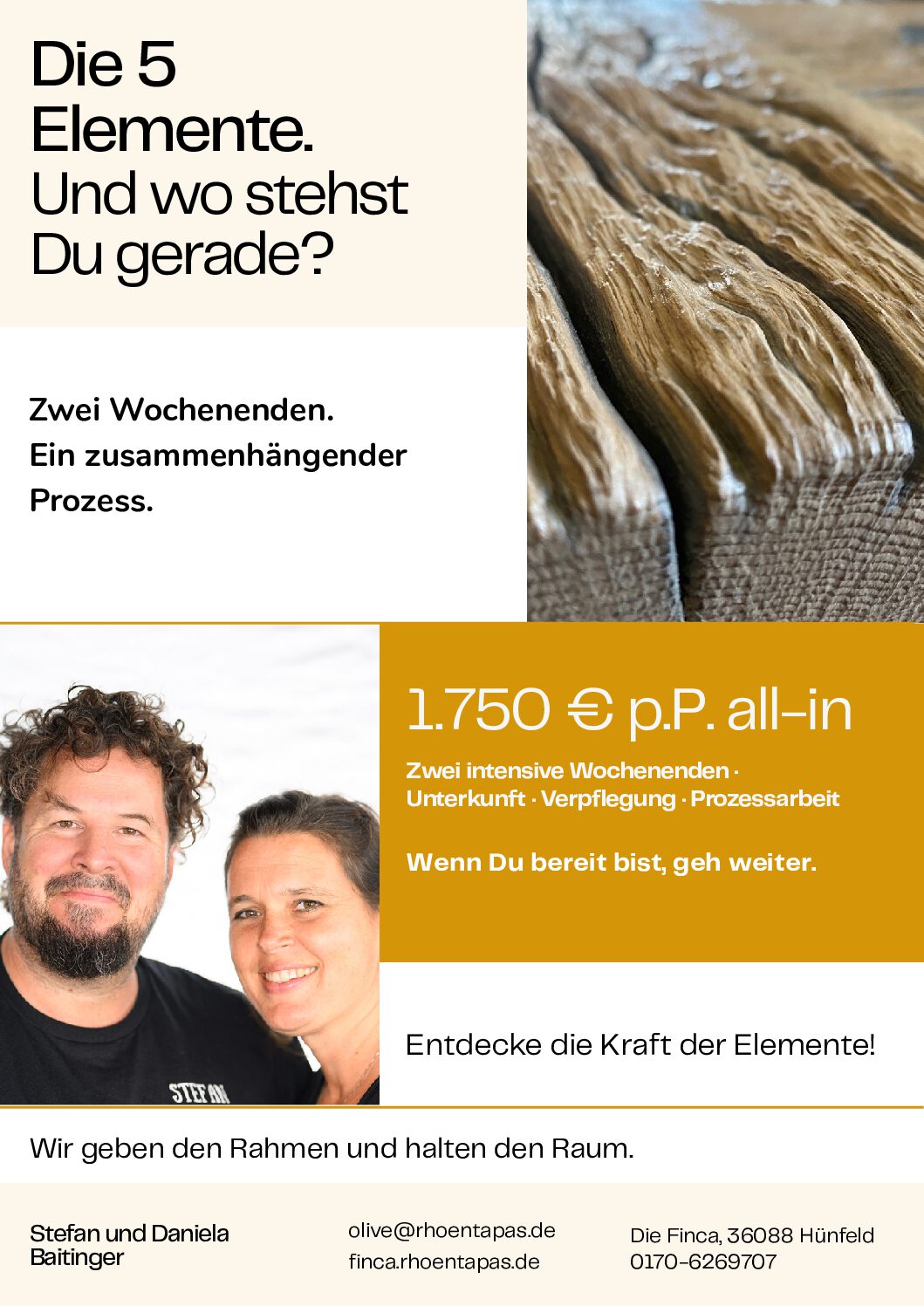 5 Elemente. Zwei Wochenenden. Ein Selbsterfahrungsprozess / 26. bis 28. Juni 2026 und 20.-22. Nov. 2026